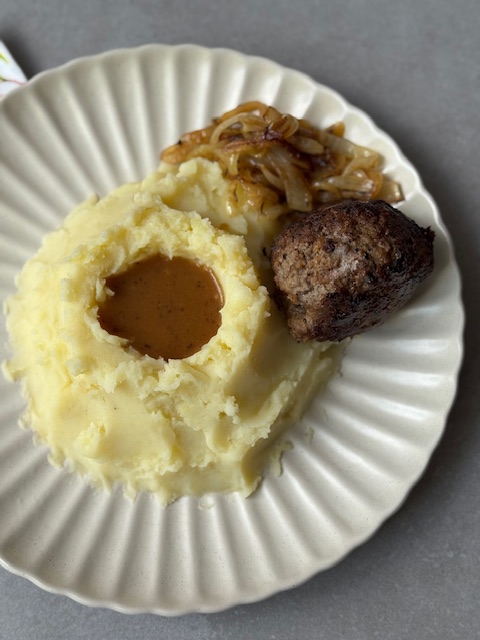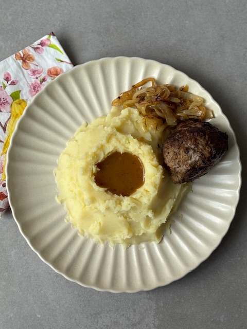 Serveer de stamppot met de uien, de jus en de gehaktbal.