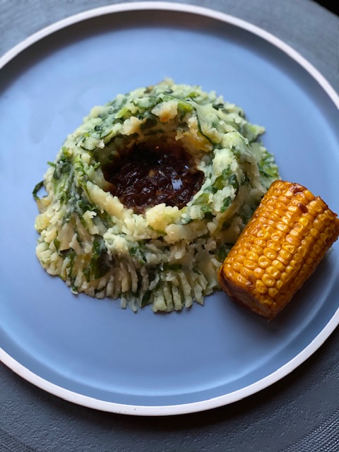 Een stamppot met spekjes en een stuk rookworst of een ouderwetse gehaktbal vind ik erg lekker. In het kader van minder vlees eten wilde ik een stamppot maken waarbij ik het vlees niet zou missen. De jus wordt dan in één klap erg belangrijk en moet zeer smaakvol zijn. Dat is gelukt! De jus is heerlijk. Een stamppot staat bekend om zijn zachte structuur die je niet zozeer hoeft te kauwen en ik vind het lekker om toch iets met een andere structuur te eten. Door maiskolven hierbij te serveren is dat goed opgelost.