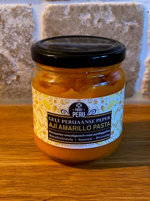 Eerder dit jaar volgde ik mijn allereerste Peruaanse workshop via Proef Peru. De workshop werd vanwege de Covid crisis online gegeven, maar dat mocht de pret niet drukken. Thuis kreeg ik een mooie doos met ingrediënten afgeleverd en zo kon ik aan de slag. Alle ingrediënten, op één na eigenlijk, kende ik al en dat vind ik zo leuk aan dit recept. Een gerecht maken met aardappels, avocado, tomaat, rode ui, mayonaise en limoen op een manier die ik nog niet kende. Maar wat is nu dat ingrediënt dat ik nog niet kende? Dat is een pasta gemaakt van 100% Peruaanse gele pepers, aji amarillo genaamd. Deze pasta kun je niet in de supermarkt kopen en Mariëla van Proef Peru wilde hier iets aan doen. Haar droom – al vanaf het eerste moment dat ik haar leerde kennen – is de Peruaanse keuken in Nederland wat bekender maken. Dit kun je natuurlijk doen door recepten te delen, maar het gebruik van authentiek Peruaanse producten is daarbij essentieel. De passie van Mariëla gaat zover dat zij besloot haar eigen aji amarillo te produceren en te verkopen. De aji amarillo is nu te koop via ‘De maaltijd winkel’ via deze link.