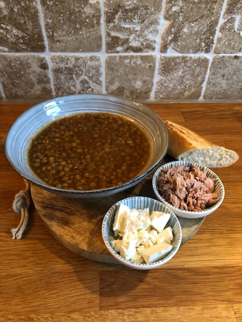Mijn peetmoeder at vaak wat gebrokkelde feta en tonijn uit een blikje bij deze soep. Deze traditie zeg ik inmiddels voort.